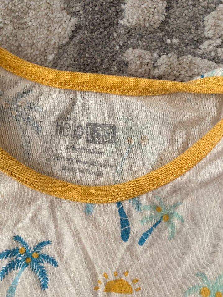 sıfır kol desenli şık sorunsuz atlet Gri ve sarı tonlarda desenli, 2 yaş (93 cm) için uygun bebek önlüğü. Türkiye'de üretilmiştir.