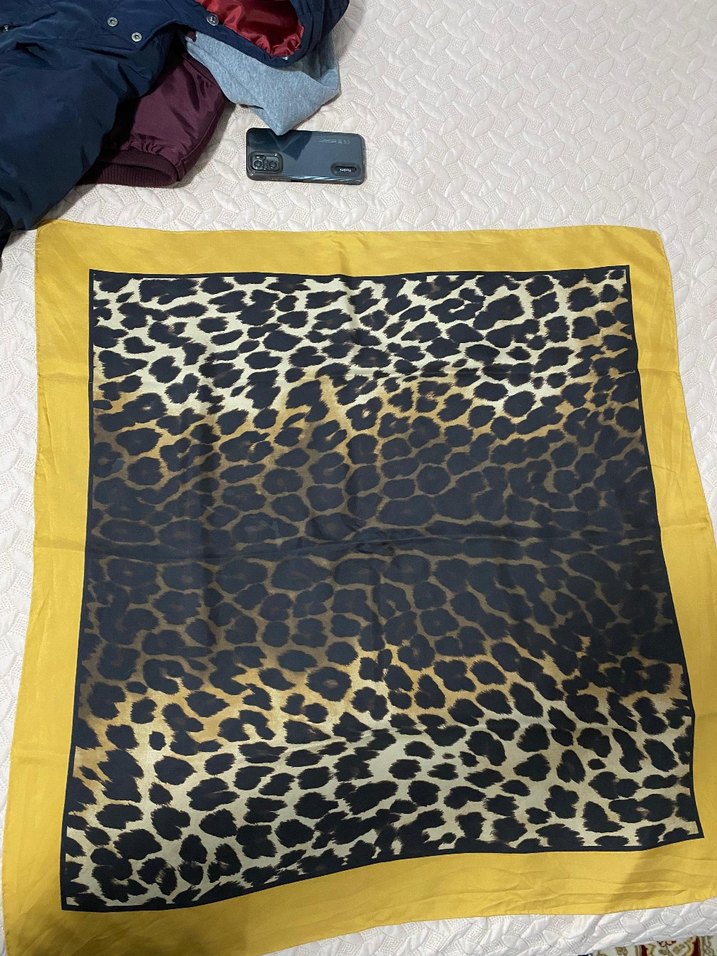 Kadın eşarp sarı kenarlı ve koyu leopar desenli,