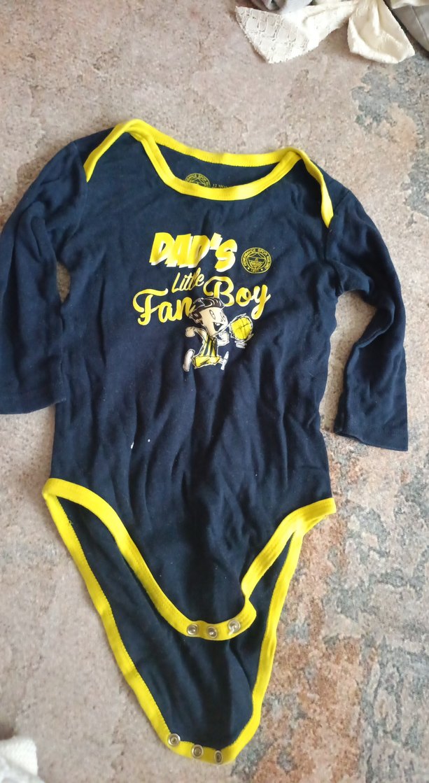 Sarı kenarlı, baskılı, koyu denim kumaştan uzun kollu erkek bebek body. Yuvarlak yakalı ve çıtçıtlı kapama özelliğine sahip.