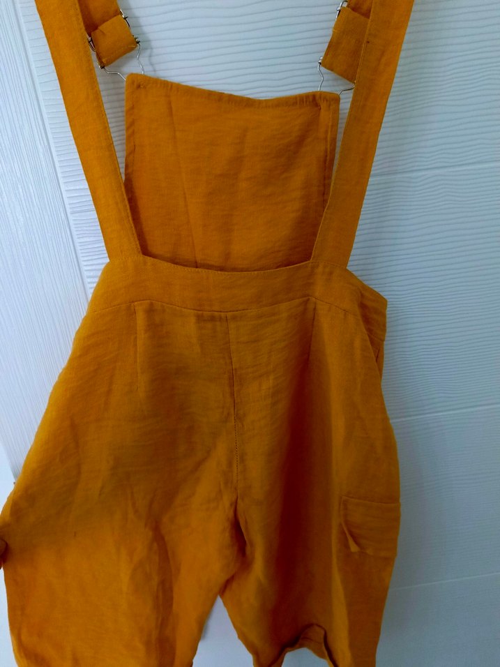 Askılı, keten kumaştan yapılmış, sarı renkli, bol kesim midi tulum. Günlük kullanım için uygundur. Hardal.