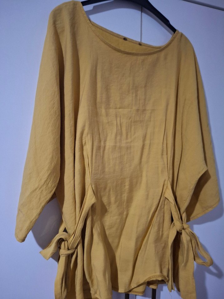 Sarı keten kumaştan, salaş kesim, drapeli ve ip detaylı, yuvarlak yaka midi boy bohem tunik.