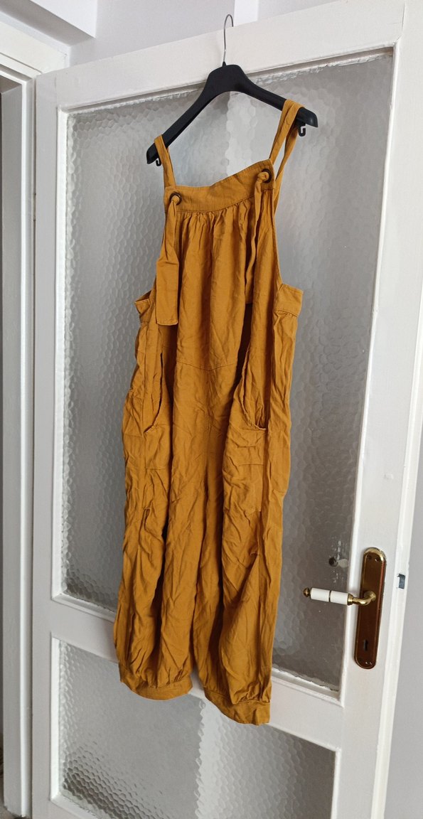 Kadınlar için keten kumaştan yapılmış, bol kesim ve drapeli tasarıma sahip, askısız ve kolsuz sarı bohem uzun tulum. Günlük kullanıma uygun.Streetbox marka.
