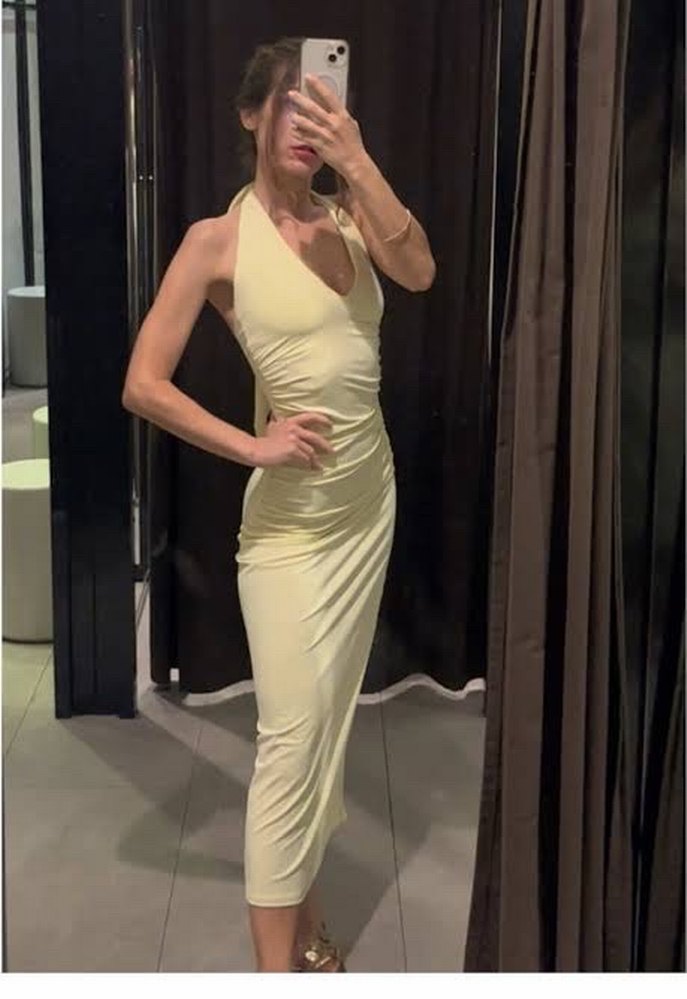 Sarı keten kumaştan, drapeli ve halter yakalı, kolsuz, vücuda oturan uzun elbise, minimalist bohem tarzı için uygun.