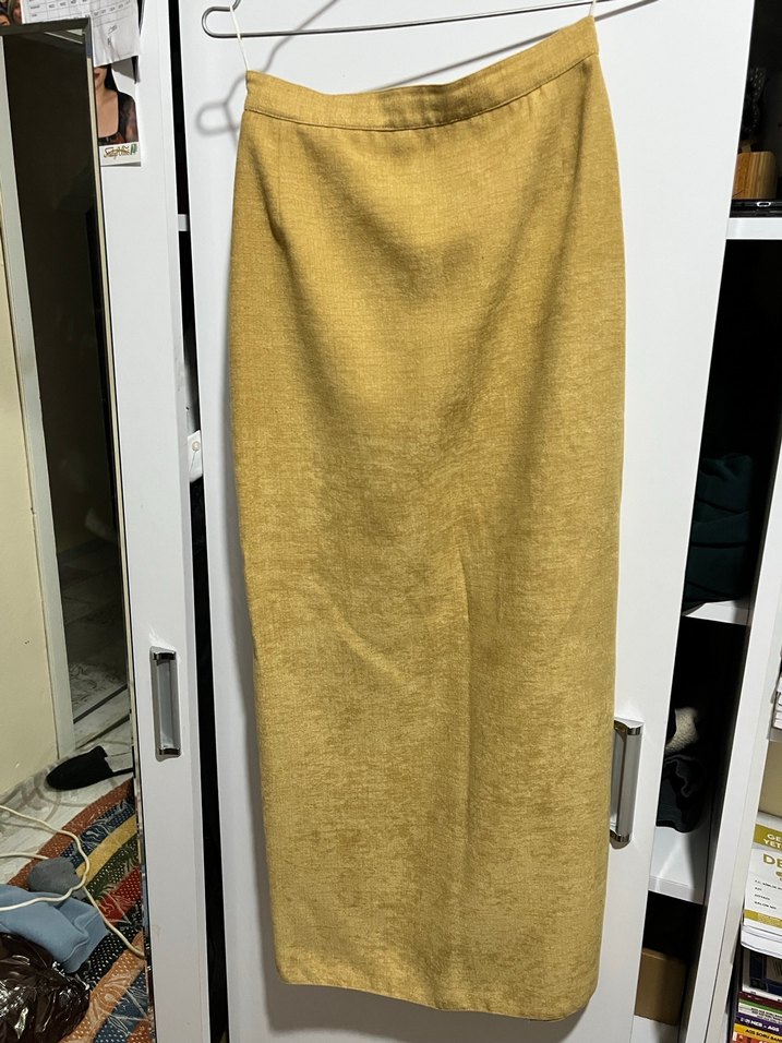 Parlak sarı keten kumaştan, drapeli ve fitted kesime sahip uzun etek. Minimalist ve desensiz, ofis için uygundur. Bedeni 42 ama kalıbı küçük biraz 38 40 bedene daha rahat olur