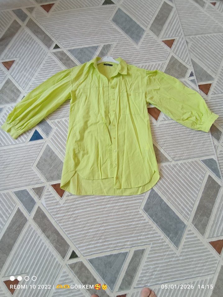 Salaş kesim, uzun kollu, yakalı ve düğmeli sarı keten gömlek. Midi boyda, rahat sokak stiline uygun bir parça.