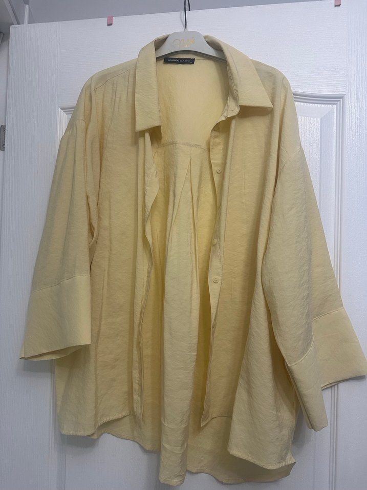 Sarı renk keten kumaştan, düğmeli ve yakalı, bol kesim uzun kollu gömlek. Normal midi boyda, günlük kullanım için uygundur.