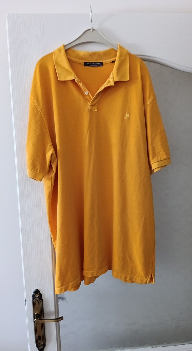 Marc O'Polo marka. XXL. Gevşek kesim, kısa kollu, yakalı sarı keten polo tişört. Düğmeli ve parlak görünümlü, günlük sokak stili için uygundur.