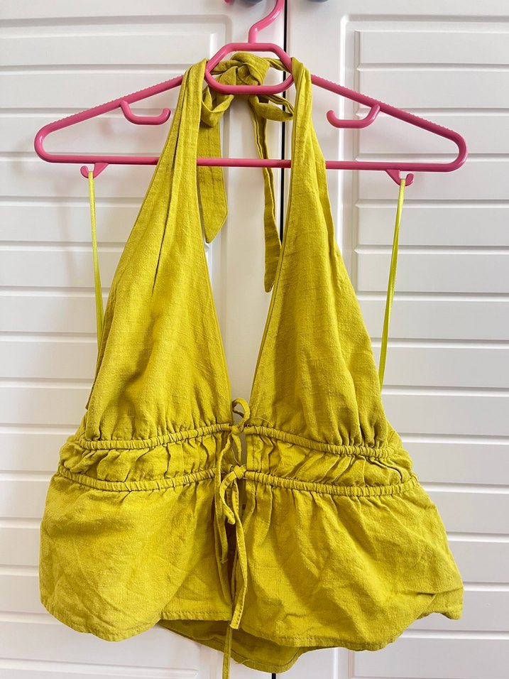 Sarı keten halter yaka, askılı, bol kesim bluz. Drapeli tasarımı ve parlak dokusuyla günlük kullanıma uygundur.