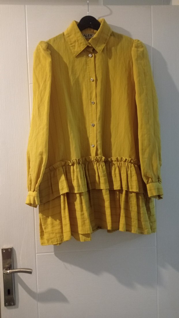 Sarı keten hamile bluzu, uzun kollu ve yakalıdır. Parlak renkte, belde fırfır detaylarıyla bohem vintage tarzı sunar.