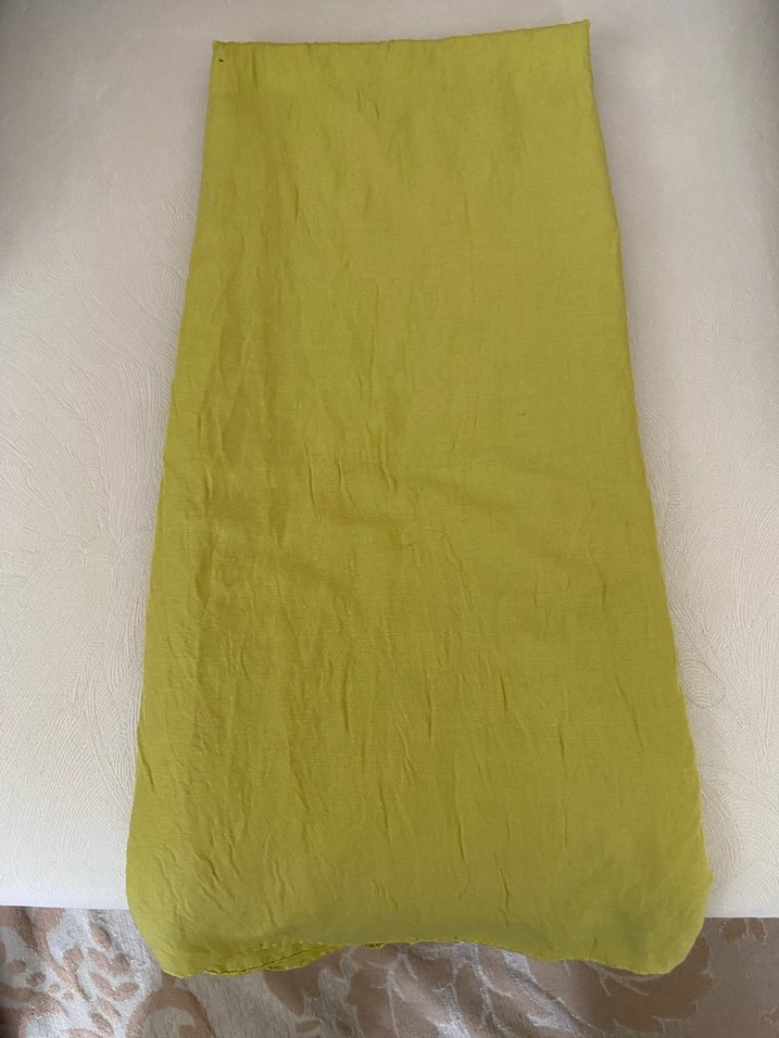 Sarı keten kumaştan yapılmış, parlak ve drapeli kadın şalı, minimal ve bohem tarz sunar.