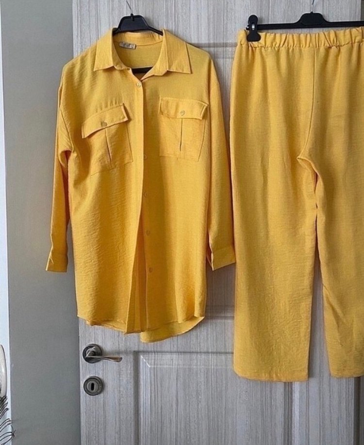 Sarı keten kumaştan, uzun kollu, düğmeli ve kesimli yakalı salaş kadın takımı. Rahat kesimiyle günlük sokak stiline uygundur.