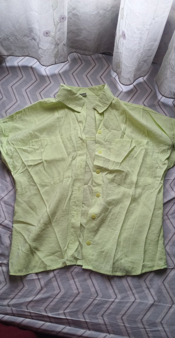 Sarı keten kumaştan, kısa kollu ve yakalı, düğmeli, salaş kesim gömlek. Düz deseniyle günlük sokak stiline uygundur.