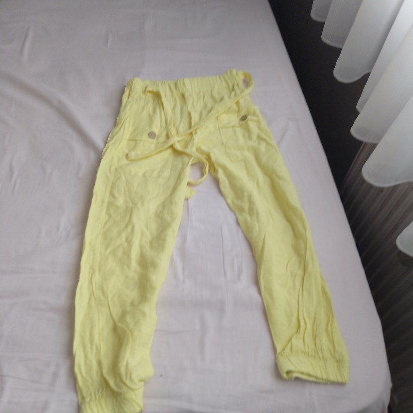 Pastel sarı keten kumaştan, rahat kesim kadın pantolon. Düğme detaylarıyla normcore tarzı, yumuşak ve nefes alabilen kumaş.