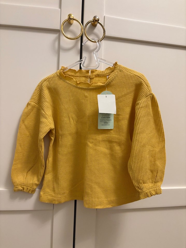 Sarı keten kumaştan, uzun kollu, yuvarlak yakalı ve düğmeli sırt detaylı kız çocuk bluz. Rahat kesimli ve baskılı dokulu.