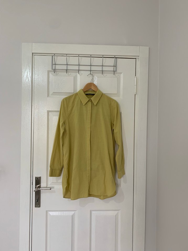 Sarı keten kumaştan, uzun kollu, yakalı, desen içermeyen, rahat kesim midi gömlek. Günlük kullanıma uygundur. Boy: 78cm En:56cm