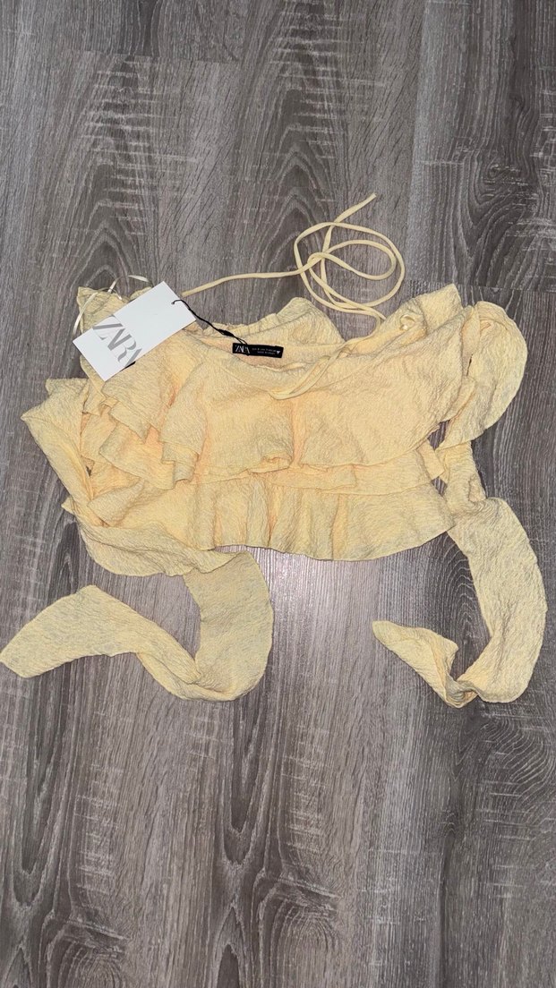 Açık sarı keten kumaştan, halter yaka ve askılı kollu, fırfırlı detaylı mini kesim crop top. Sokak modası ve günlük kullanım için uygundur.