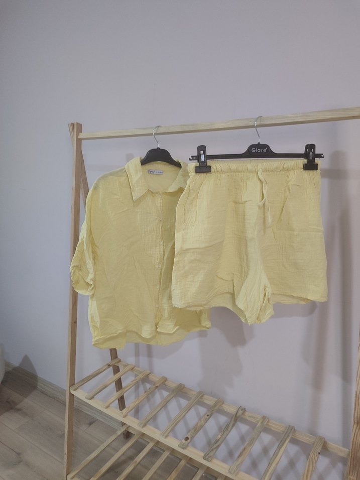 Hafif sarı renkte, keten kumaştan, kısa kollu ve bol kesim kadın gömleği, yuvarlak yakalı, rahat ve şık bir görünüm sağlar. Takım