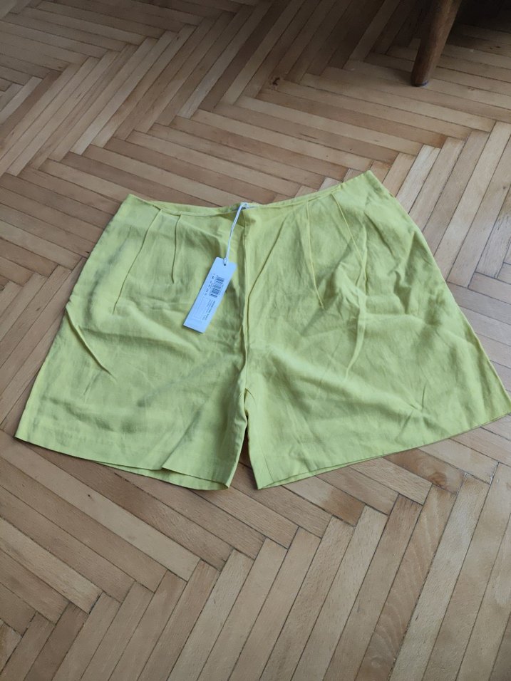 Yumuşak keten kumaştan yapılmış, pastel sarı renkli, rahat kesim mini şort. Günlük kullanım için minimal ve zahmetsiz şıklık sunar.