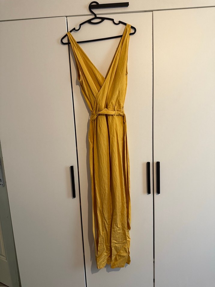 Sarı keten uzun elbise, drapeli tasarım ve ince askılarla, önü arkası v yaka, belden kuşaklı,minimalist bohem tarz için uygun. Keteni yumuşacık akıcı tiril tiril