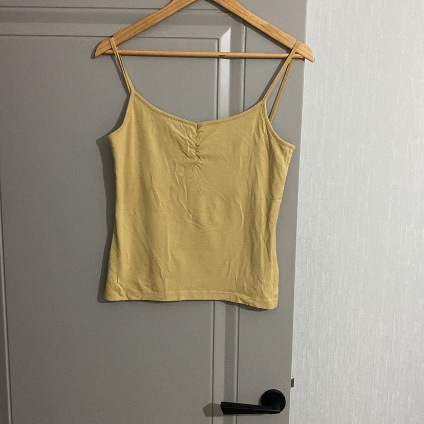 Nefes alabilen keten kumaştan, V yakalı ve kolsuz, sarı renkli fitted mini atlet. Pastel tonu ve sade tasarımı günlük sokak stiline uygundur.