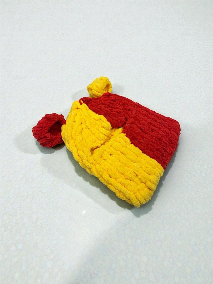 Yumuşak örgüden üretilmiş, sarı ve kırmızı renklerde bağlama desenli çocuk bere ve atkı seti.