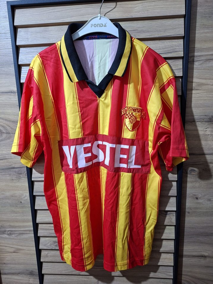 Sarı ve kırmızı çizgili, V-yaka erkek spor tişörtü. Parlak sentetik kumaştan, kısa kollu ve bol kesim. Önünde 'YESTEL' baskısı ve cırt cırt detay bulunur. ♂️