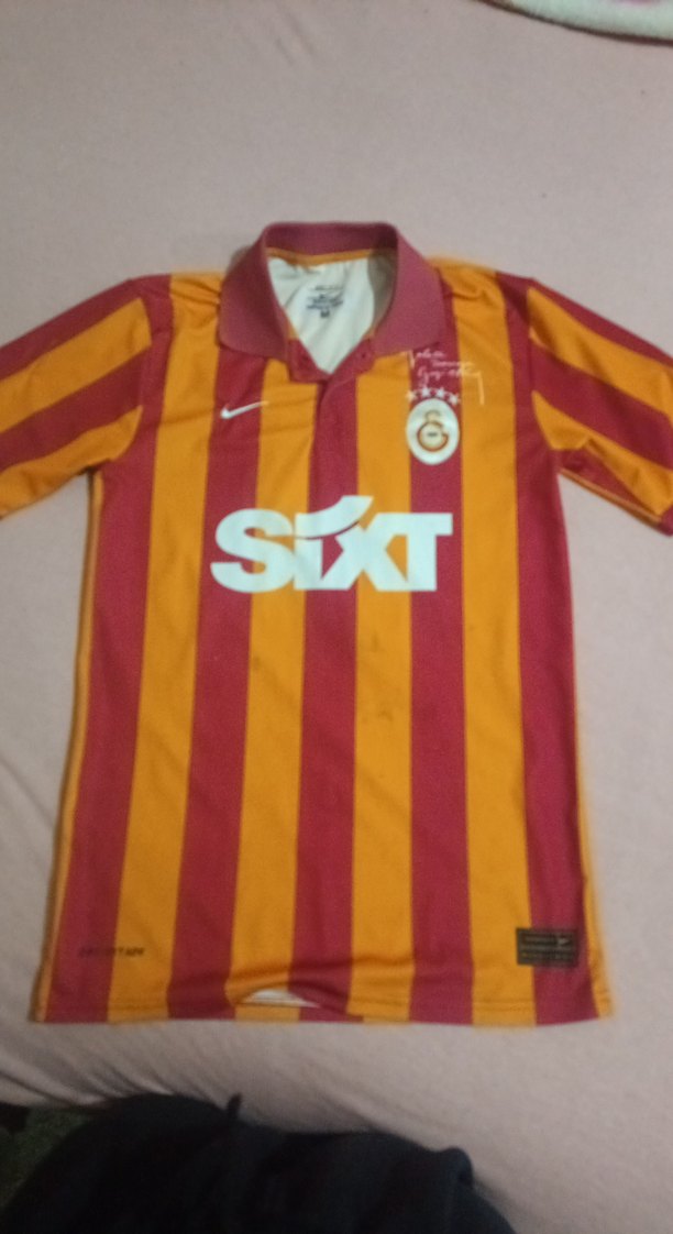 Bol kesim kısa kollu unisex forma, düğmeli yaka detayıyla. Parlak sarı-kırmızı çizgili, sentetik kumaş üzerinde baskılı logo ve "SIXT" yazısı bulunur. Spor ve günlük kullanıma uygun. M beden fakat L bedene de çok rahat olur. 3. görselde belirttiğim gibi bir yağ lekesi var muhtemleen bi leke çözücüyle cıkarılabilir. bir butikten 350 tlye almıstım.