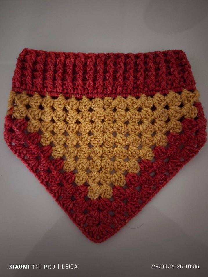 Sarı ve kırmızı renklerde, örgü dokusuyla bohem tarzı yansıtan kadın boyunluk.