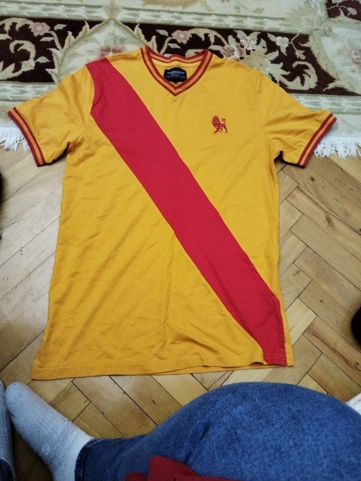 Kısa kollu, V yaka, renkli sarı ve kırmızı baskılı erkek polo tişört. Sentetik kumaş ve cırt cırt detayına sahip, şık ve rahat kesim.