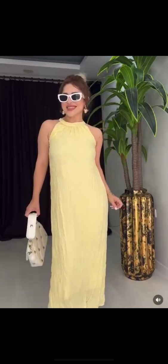 uzun elbise, salaş kesim ve sarı ipeksi dokuda, rahat sokak stili ve parti için uygun.