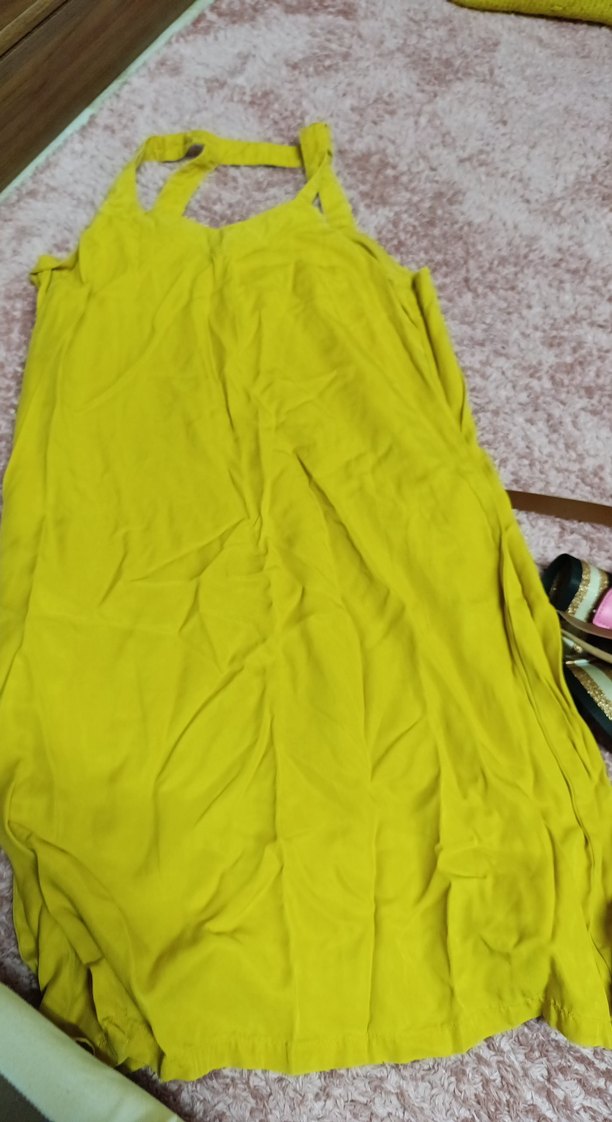 Sarı renkli, askısız ve kolsuz, dökümlü ve bol kesim bohem tarzda kadın elbise Sentetik kumaştan üretilmiştir, günlük dış mekan kullanımı için uygundur. keten
