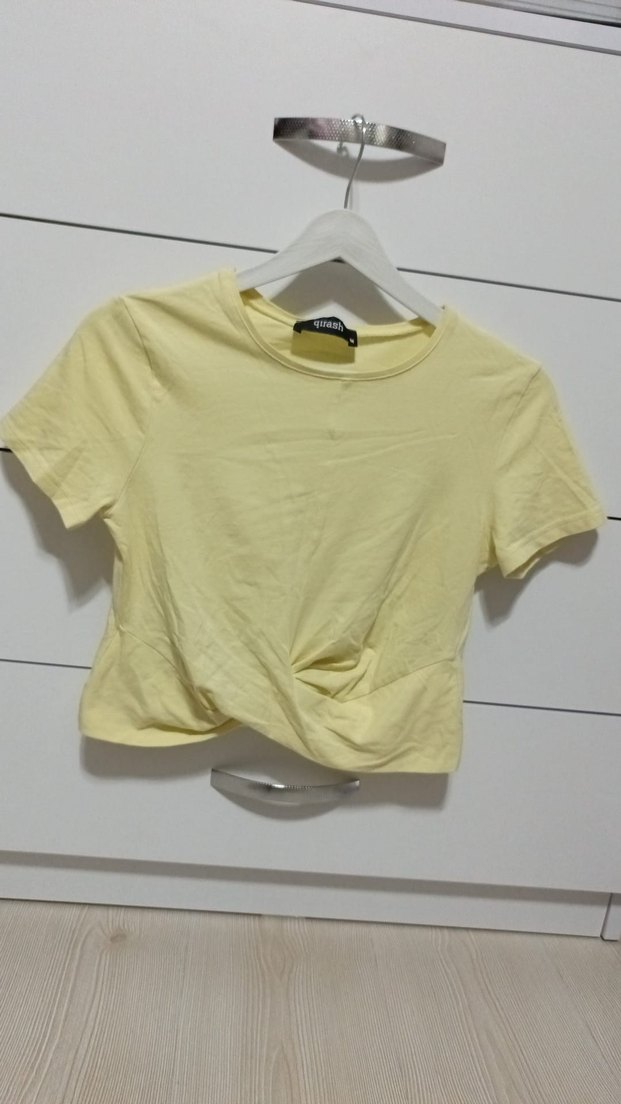 Sarı renkli, kısa kollu, bisiklet yaka ve ince kumaştan yapılmış, kısa boy basic kadın tişörtü. Günlük sokak stiline uygundur.
