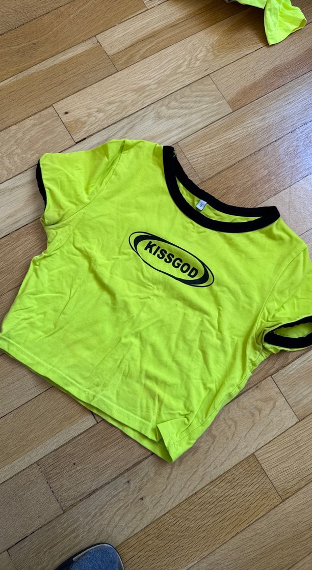 Sarı pamuklu tişört, kısa kollu ve bisiklet yaka. Renkli 'KISSGOD' baskılı, bol ve mini kesimle rahat bir sokak tarzı sunar.