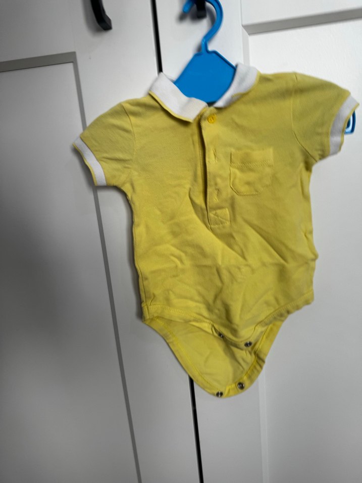 Pastel sarı renkte, kısa kollu ve yakalı bebek body. Pamuk kumaştan, düğmeli ve küçük göğüs cebine sahip. Alt kısmında çıtçıtlar mevcut.