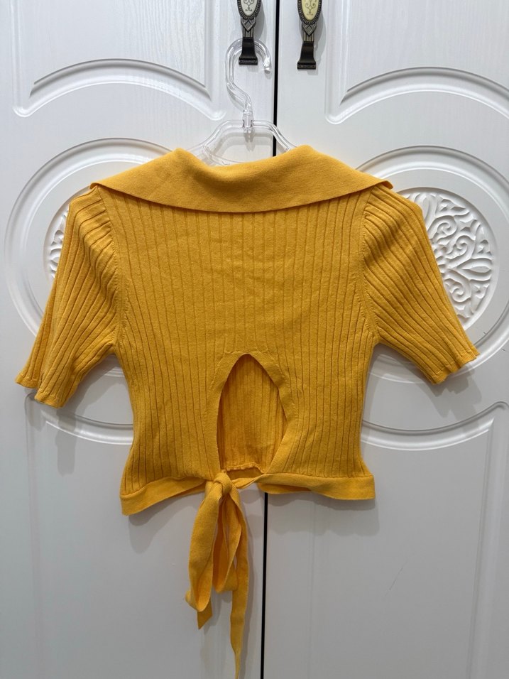 Sarı renkli, boğazlı ve kısa kollu, örgü yapıda, belde bağlama detayı olan kısa boy kadın kazak.