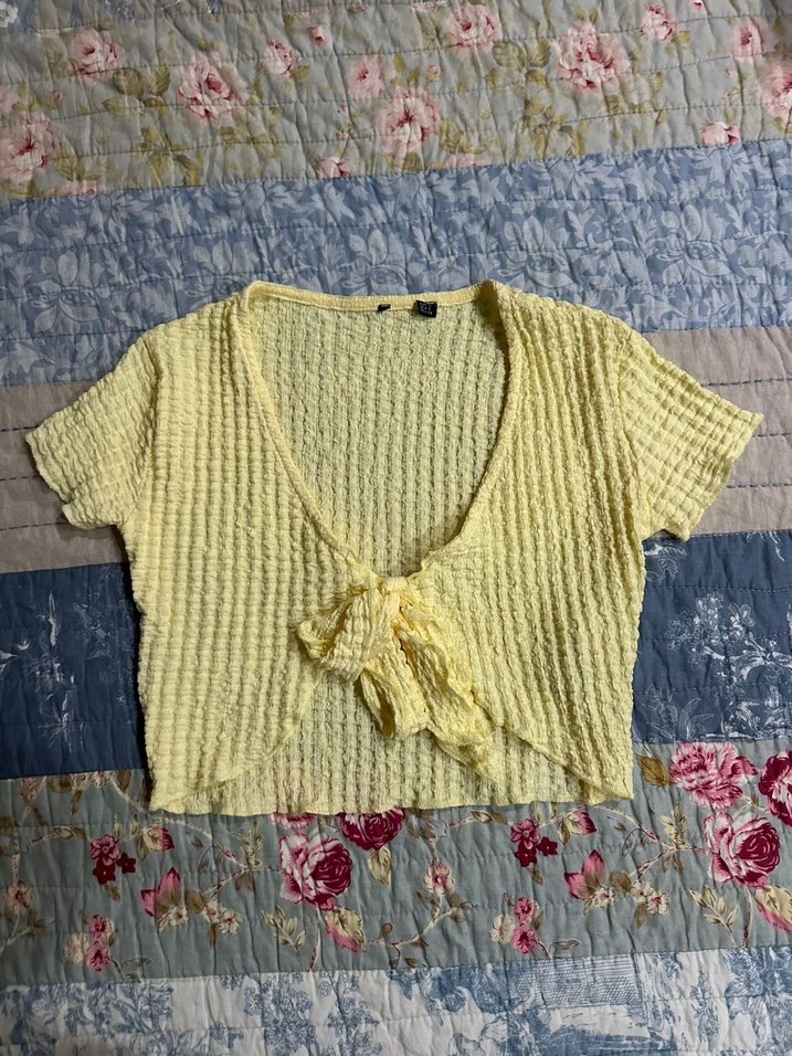 Sarı renkli, örme keten kumaştan yapılmış, V yakalı ve kısa kollu, bol kesim bohem tarzında bluz