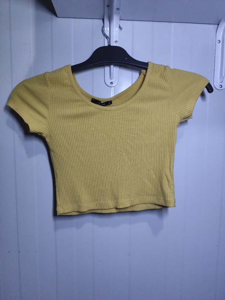 Pastel sarı renkte, kısa kollu ve bisiklet yaka crop top. Yumuşak sentetik kumaştan, rahat ve şık bir günlük stil sağlar.