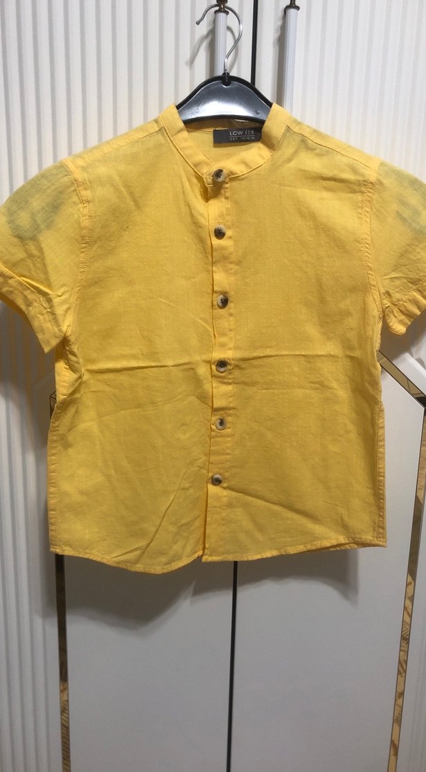 Sarı renkli, keten kumaştan yapılmış, kısa kollu ve düğmeli erkek gömlek. Bol kesim ve yakalı tasarımıyla sade, parlak bir görünüm sunar.