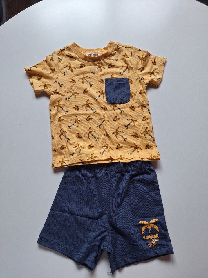 Pamuklu sarı kısa kollu tişört, palmiye desenli ve lacivert cep detaylıdır. Lacivert nakışlı şort ile kombinedir. Rahat ve şık bebek takımı.