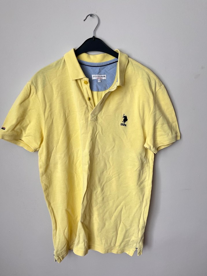 Pastel sarı renkte, yumuşak keten kumaştan yapılmış, yakalı ve kısa kollu, vücuda oturan erkek polo tişörtü. Günlük kullanım için rahat ve şık bir sokak stili sunar.