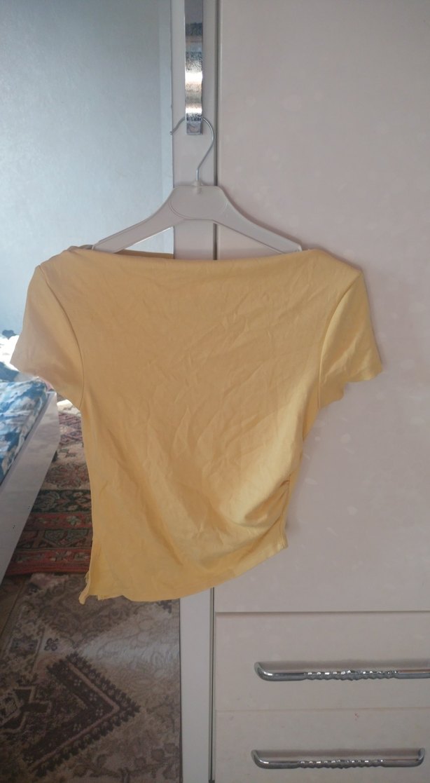 Sarı pastel tonlarında, kısa kollu, bisiklet yaka ve drapeli hamile gömleği. Keten kumaştan, normal midi boyda, günlük kullanıma uygun.