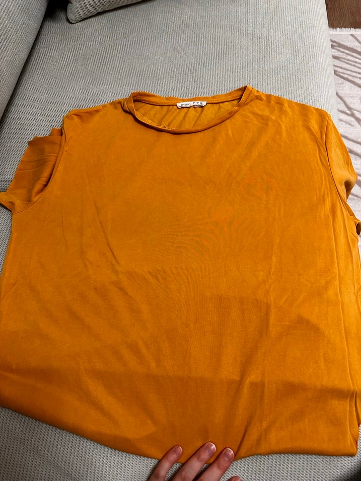Yumuşak keten kumaştan, kısa kollu, bisiklet yaka, bol kesim sarı hamile tişörtü. Günlük kullanıma uygun rahat ve sade model.