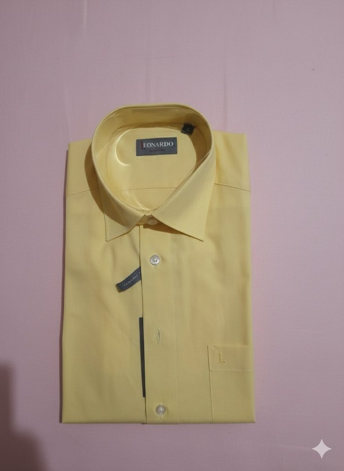 Sarı kısa kollu, yakalı ve düğmeli erkek gömleği. İpek gibi yumuşak kumaştan, normal kesim ve pastel renkte. EONARDO markalı, ofis kullanımı için uygun.