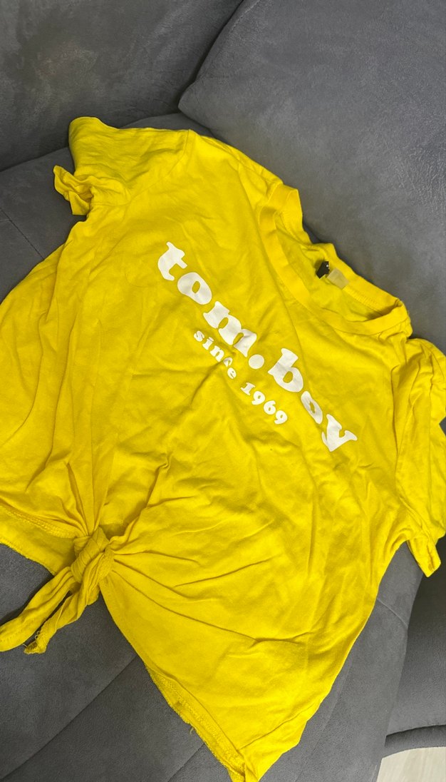 Sarı, kısa kollu, bol kesim kadın tişörtü. Baskılı ve fiyonk detaylı, yumuşak keten kumaştan, günlük kullanım için uygundur.