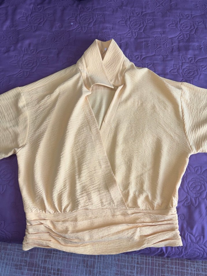 Bej keten hamile bluz, yüksek yakalı ve drapeli tasarıma sahip. Kısa kollu, vücuda oturan ve midi boyda, günlük kullanıma uygun.