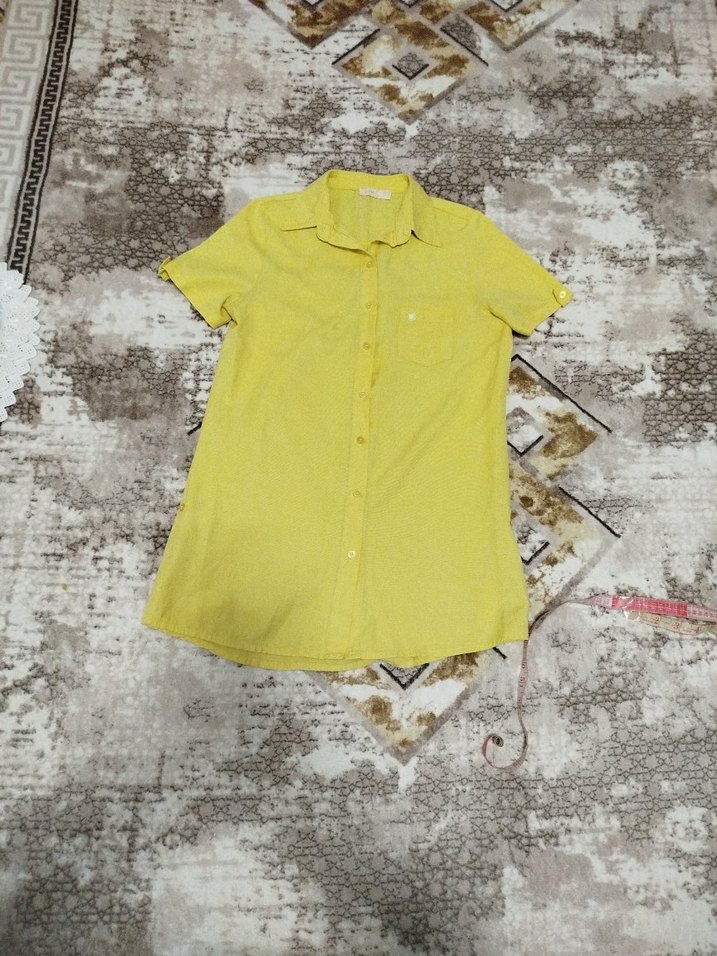 ürün sayılı kullanıldı sıkıntısı yokSarı keten gömlek, kısa kollu ve düğmeli, rahat kesim ve yakalı. Günlük sokak stili için uygundur.