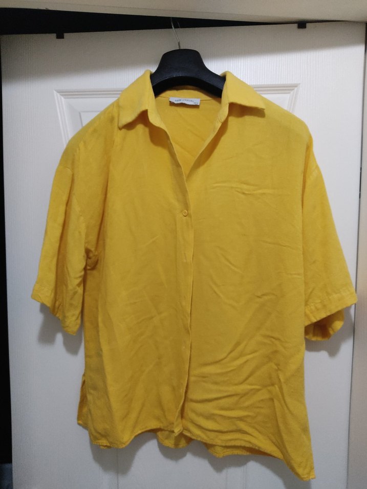 Kısa kollu, yakalı, düğmeli ve bol kesim sarı keten gömlek. Parlak dokusu günlük kullanım için uygundur. Geniş kalıptır
