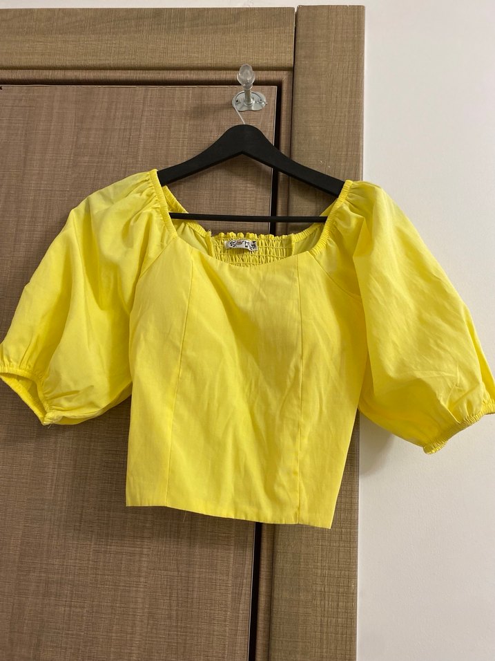 Sarı keten bluz, tek düğmeli ve kısa mini boyda. Geniş yakalı ve kısa, bol kollu tasarımıyla günlük sokak stiline uygun.