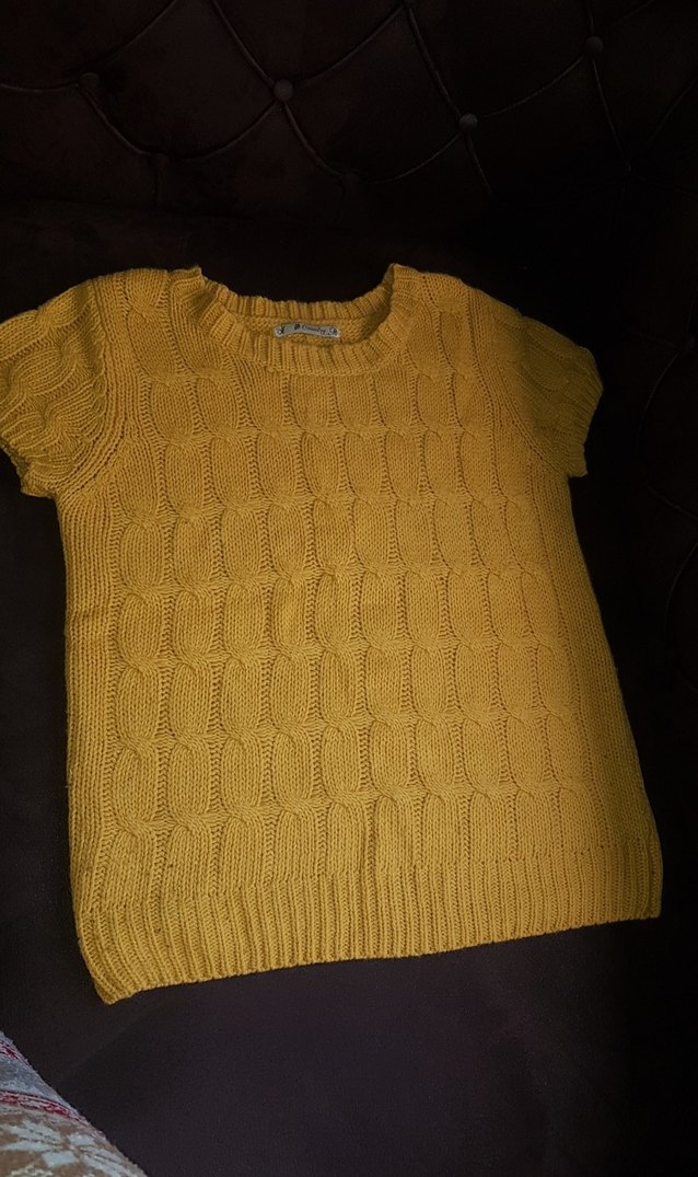 Sarı renkli, kısa kollu, örgü kadın kazak. Yuvarlak yaka ve salaş kesim, normal midi boyunda. Parlak dokusu ve sade deseniyle rahat bir tarz sunar.