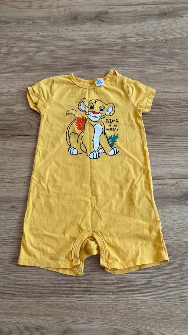 Kısa kollu, yuvarlak yakalı sarı pamuklu bebek tulumu, renkli baskılı ve düğmeli tasarıma sahiptir.